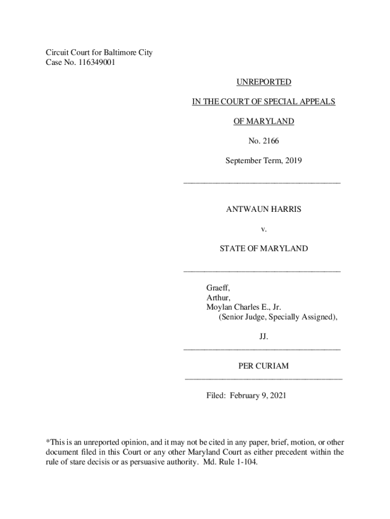 Circuit Court for Baltimore City Case No. 116349001 UNREPORTED IN THE COURT OF SPECIAL APPEALS OF MARYLAND No. 2166 September Term, 2019 ___ANTWAUN HARRIS v. STATE OF MARYLAND ___ Graeff, Arthur,
