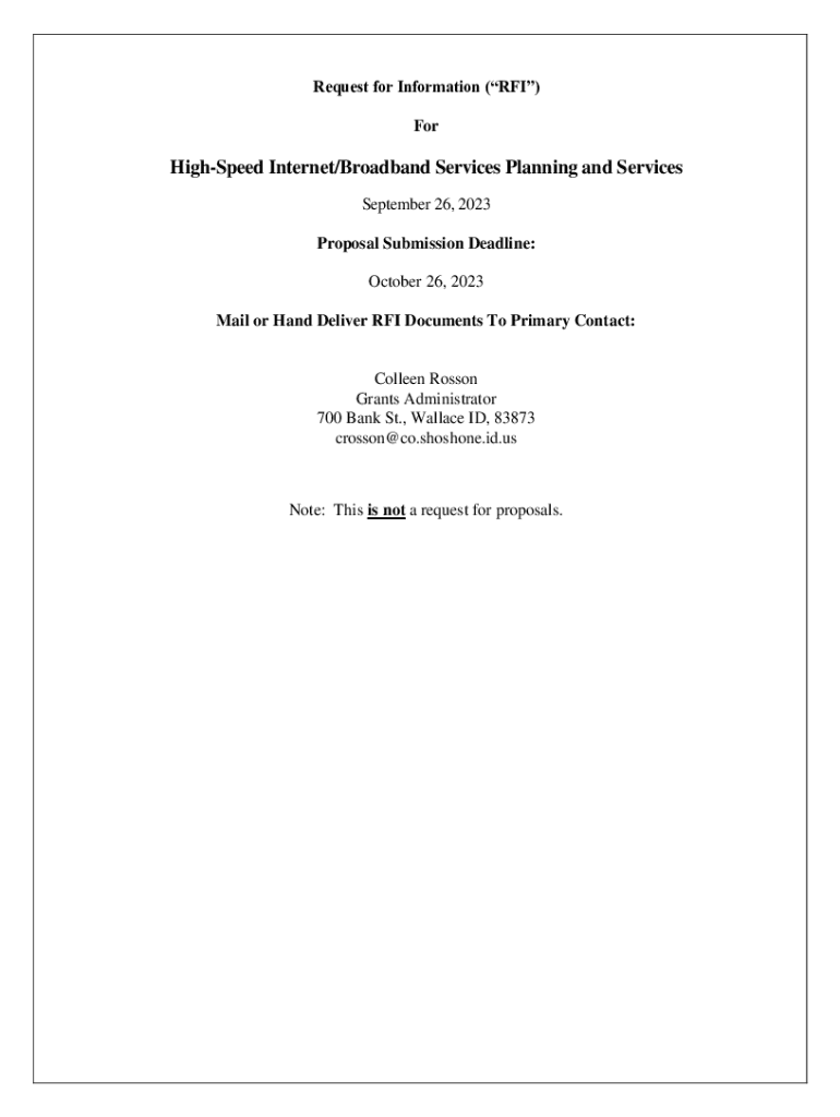 Request for Information (RFI) ForHighSpeed Internet/Broadband Services Planning and Services September 26, 2023 Proposal Submission Deadline: October 26, 2023 Mail or Hand Deliver RFI Documents To