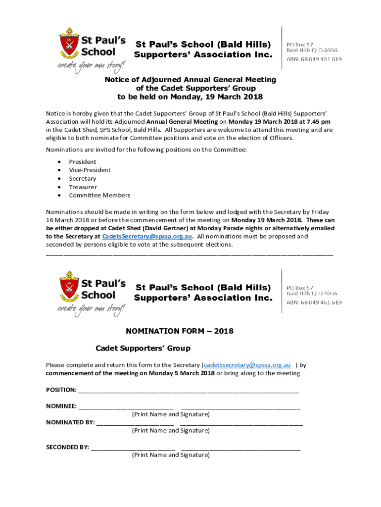 Notice of Adjourned Annual General Meeting of the Cadet Supporters Group to be held on Monday, 19 March 2018 Notice is hereby given that the Cadet Supporters Group of St Pauls School (Bald Hills)