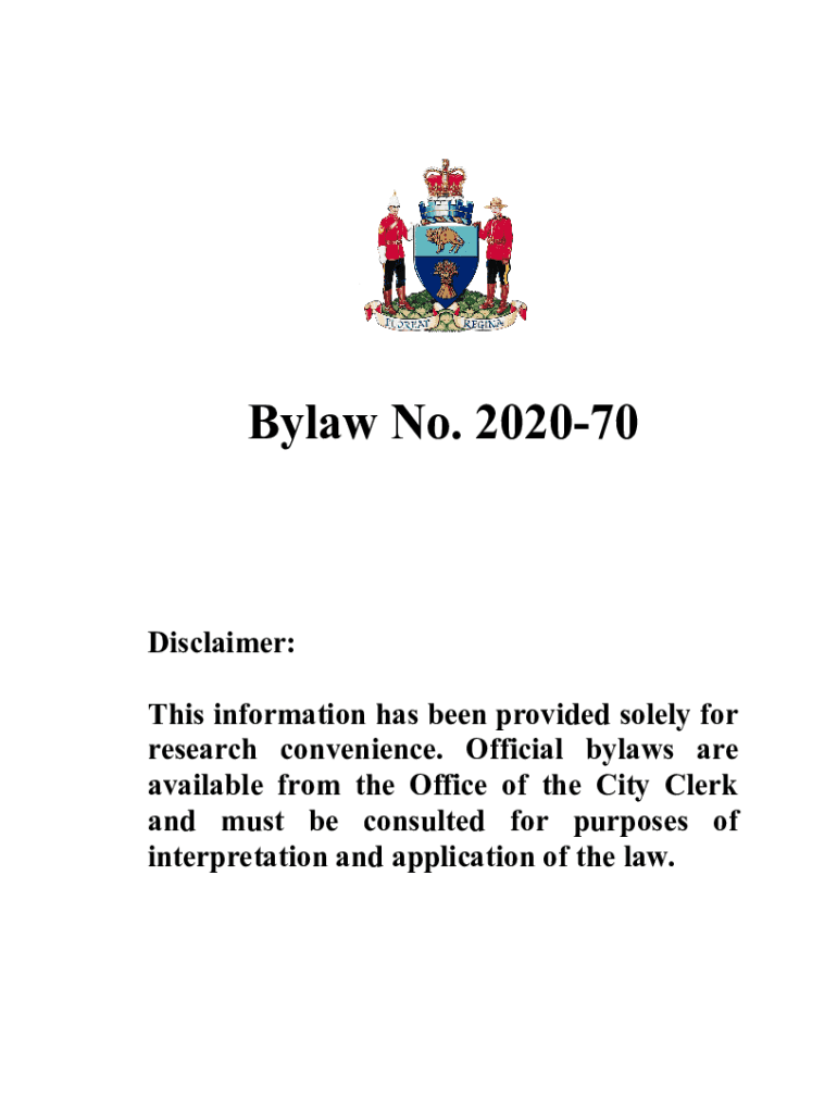 Bylaw No. 202070Disclaimer: This information has been provided solely for research convenience. Official bylaws are available from the Office of the City Clerk and must be consulted for purposes of
