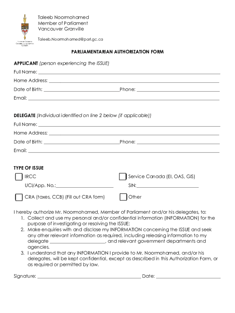 Taleeb.Noormohamed@parl.gc.caPARLIAMENTARIAN AUTHORIZATION FORM