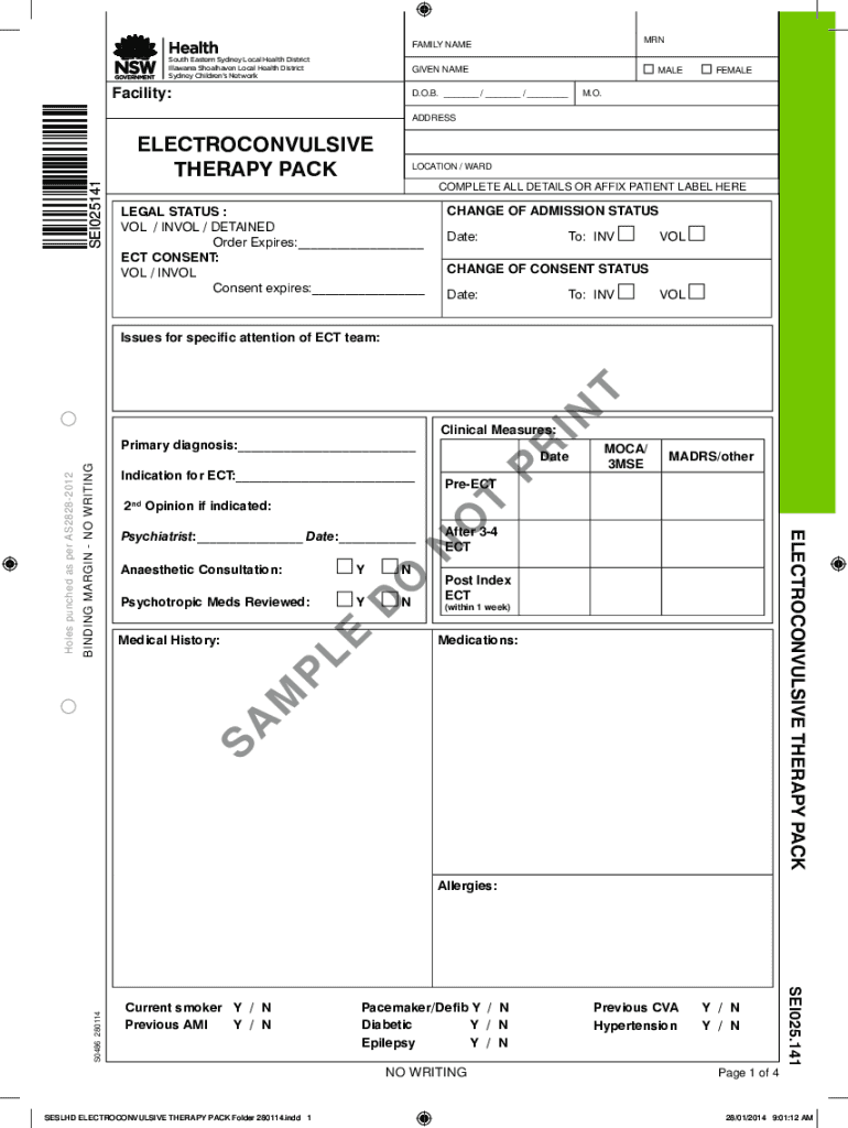 MRNFAMILY NAME South Eastern Sydney Local Health District Illawarra Shoalhaven Local Health District Sydney Childrens NetworkGIVEN NAME D.O.B. ___ / ___ / ___FEMALEM.O.ADDRESSSEI025141SEI\"SI,Facility:MALEELECTROCONVULSIVE