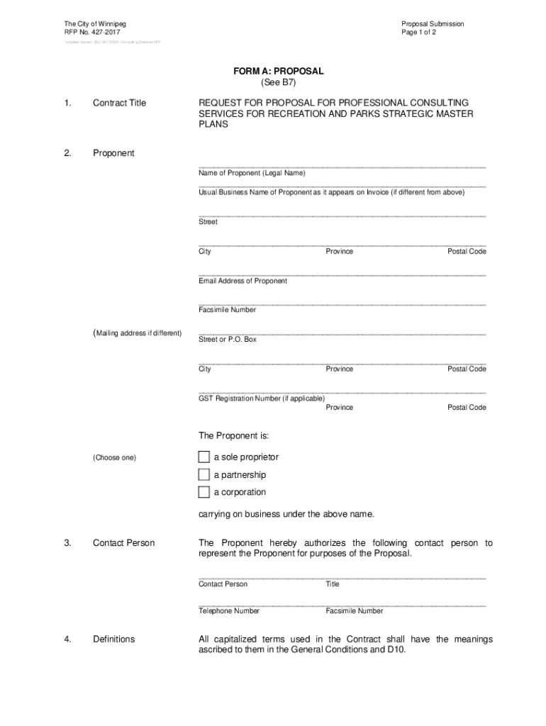 The City of Winnipeg RFP No. 4272017Proposal Submission Page 1 of 2Template Version: SrC120170324 Consulting Services RFPFORM A: PROPOSAL (See B7) 1.Contract Title2.ProponentREQUEST FOR PROPOSAL FOR
