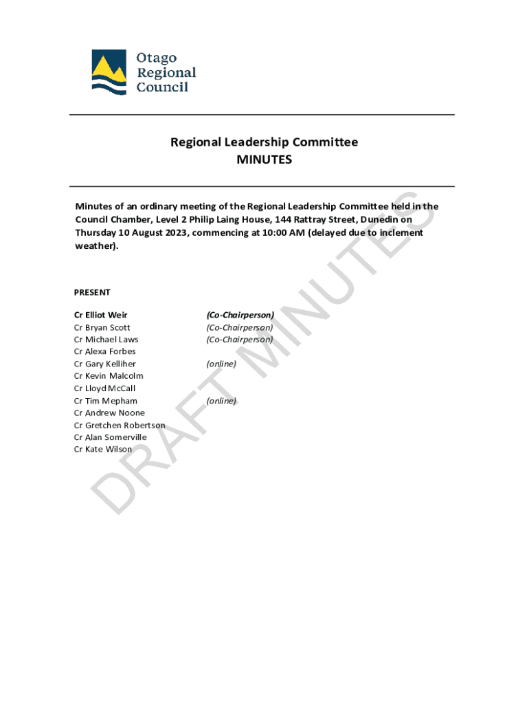Regional Leadership Committee MINUTESPRESENTMIN(CoChairperson) (CoChairperson) (CoChairperson) (online)TCr Elliot Weir Cr Bryan Scott Cr Michael Laws Cr Alexa Forbes Cr Gary Kelliher Cr Kevin Malcolm
