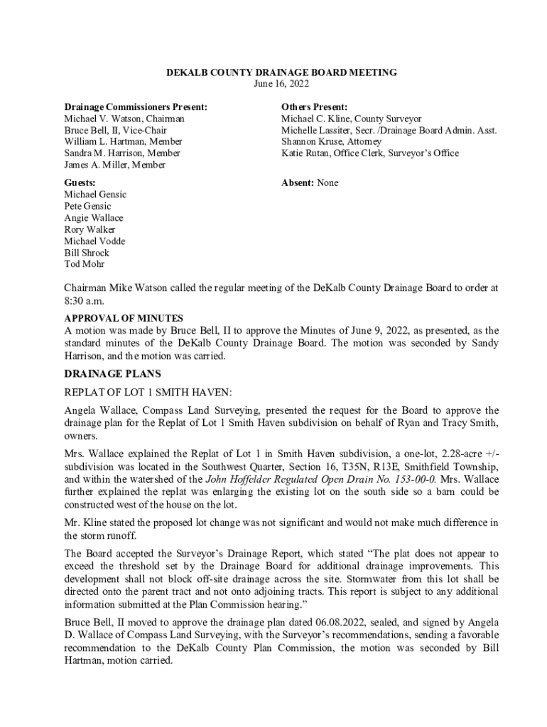 DEKALB COUNTY DRAINAGE BOARD MEETING June 16, 2022 Drainage Commissioners Present: Michael V. Watson, Chairman Bruce Bell, II, ViceChair William L. Hartman, Member Sandra M. Harrison, Member James