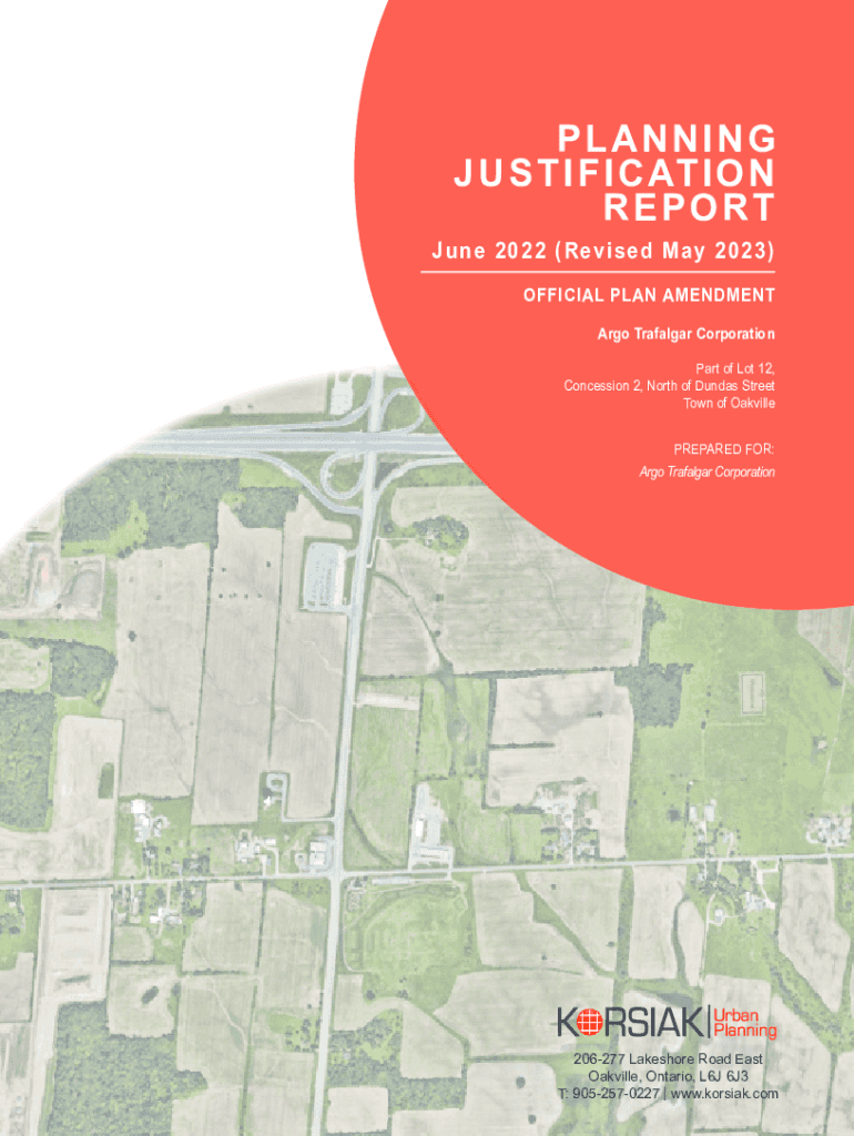 PLANNING J U S T I F I C AT I O N REPORT June 2022 (Revised May 2023) OFFICIAL PLAN AMENDMENT Argo Trafalgar Corporation Part of Lot 12, Concession 2, North of Dundas Street Town of Oakville PREPARED