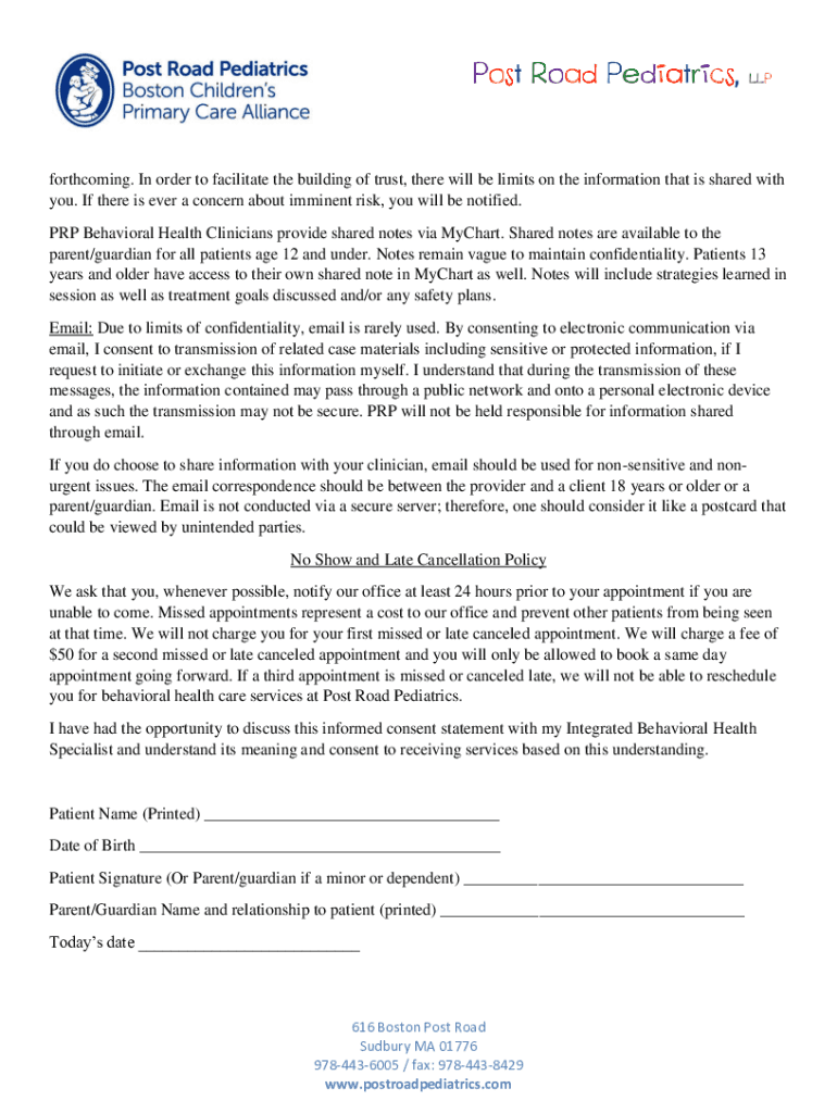 Consent to Behavioral Health Evaluation and Treatment I allow the behavioral health providers of Post Road Pediatrics to provide me/my child with behavioral health care services. I acknowledge that