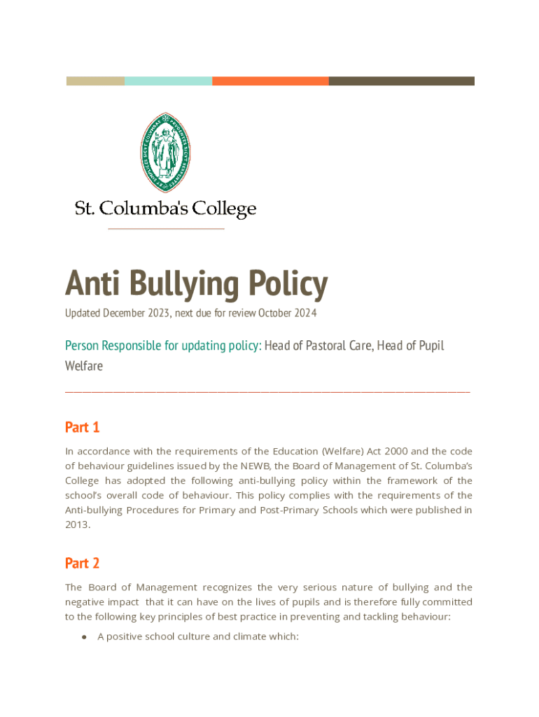 Anti Bullying Policy Updated December 2023, next due for review October 2024Person Responsible for updating policy: Head of Pastoral Care, Head of Pupil Welfare ___Part 1 In accordance with the requirements