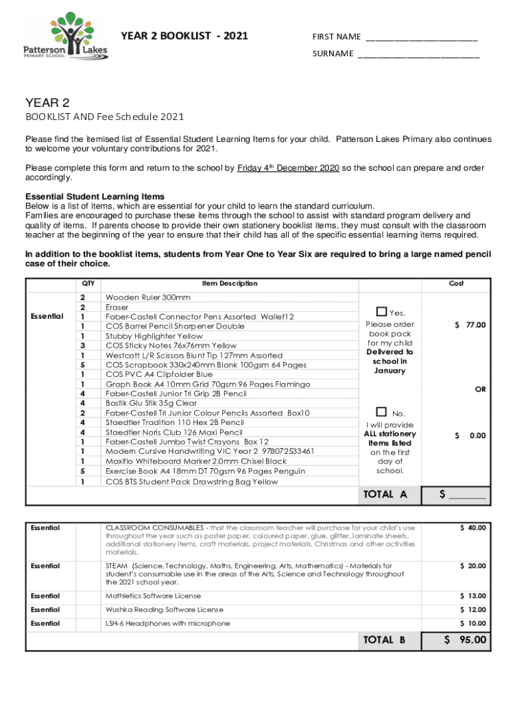 YEAR 2 BOOKLET 2021FIRST NAME ___ SURNAME ___YEAR 2 BOOKLET AND Fee Schedule 2021 Please find the itemized list of Essential Student Learning Items for your child. Patterson Lakes Primary also continues
