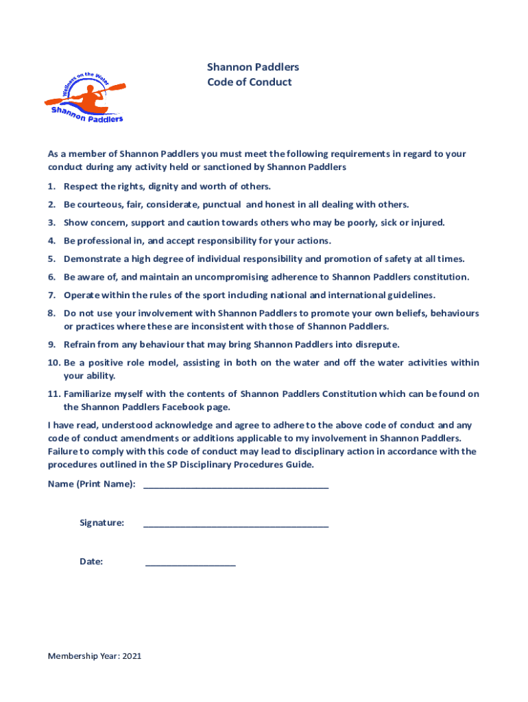 Shannon Paddlers Code of ConductAs a member of Shannon Paddlers you must meet the following requirements in regard to your conduct during any activity held or sanctioned by Shannon Paddlers 1. Respect