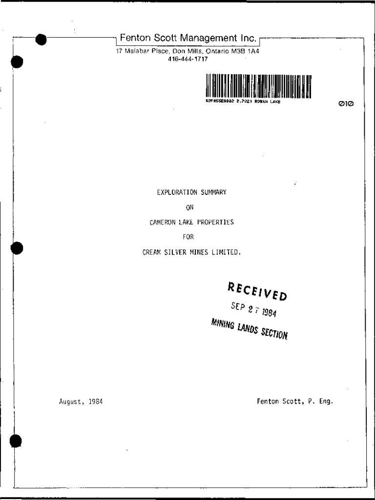 Fenton Scott Management Inc. 17 Malabar Place, Don Mills, Ontario MSB 1A4 41644417172.7331 ROWAN LAKEEXPLORATION SUMMARY ON CAMERON LAKE PROPERTIES FORFCREAM SILVER MINES LIMITED.LANDSAugust, 1984SECTIONFenton