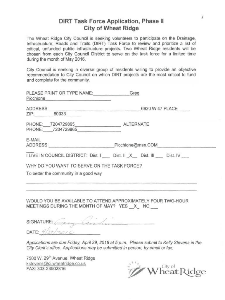 IDIRT Task Force Application, Phase II City of Wheat Ridge The Wheat Ridge City Council is seeking volunteers to participate on the Drainage, Infrastructure, Roads and Trails (DIRT) Task Force to