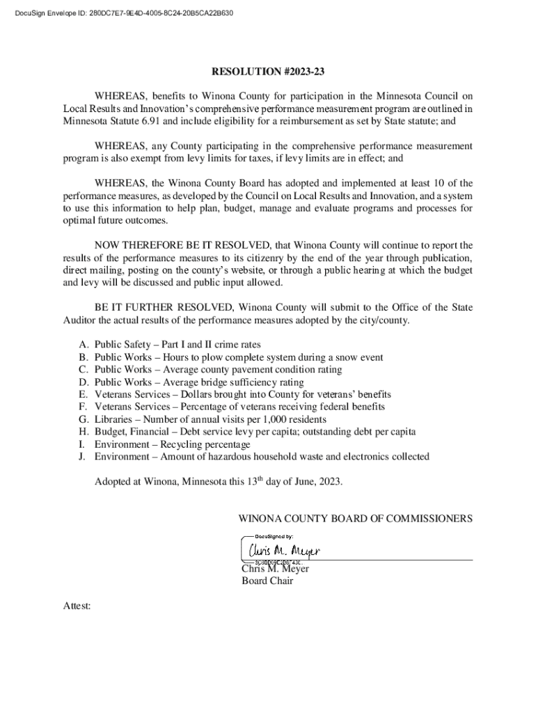 DocuSign Envelope ID: 280DC7E79E4D40058C2420B5CA22B630RESOLUTION #202323 WHEREAS, benefits to Winona County for participation in the Minnesota Council on Local Results and Innovations comprehensive
