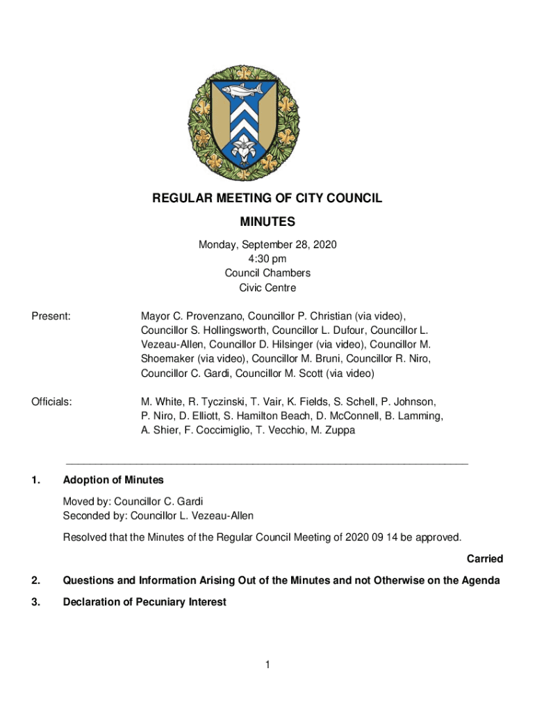 REGULAR MEETING OF CITY COUNCIL MINUTES Monday, September 28, 2020 4:30 pm Council Chambers Civic Centre Present:Mayor C. Provenzano, Councillor P. Christian (via video), Councillor S. Hollingsworth,