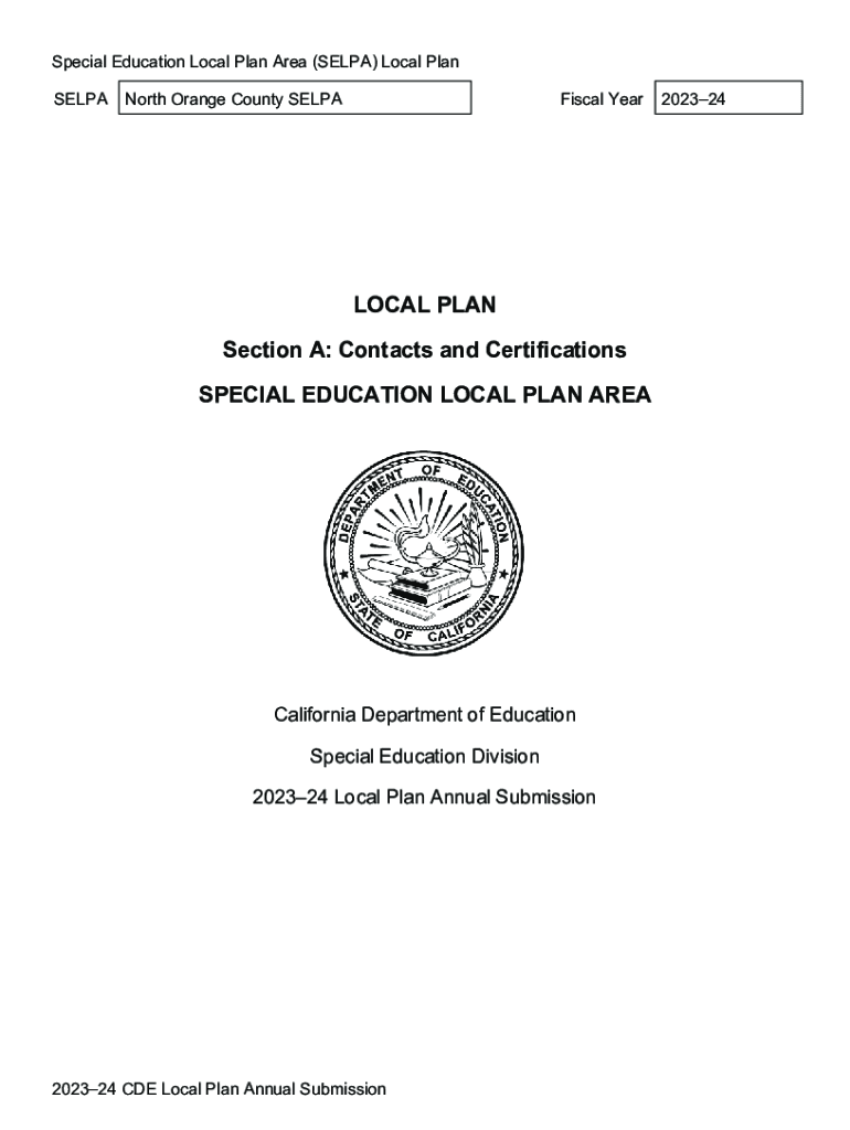 Special Education Local Plan Area (SELPA) Local Plan SELPANorth Orange County SELPAFiscal YearLOCAL PLAN Section A: Contacts and Certifications SPECIAL EDUCATION LOCAL PLAN AREACalifornia Department