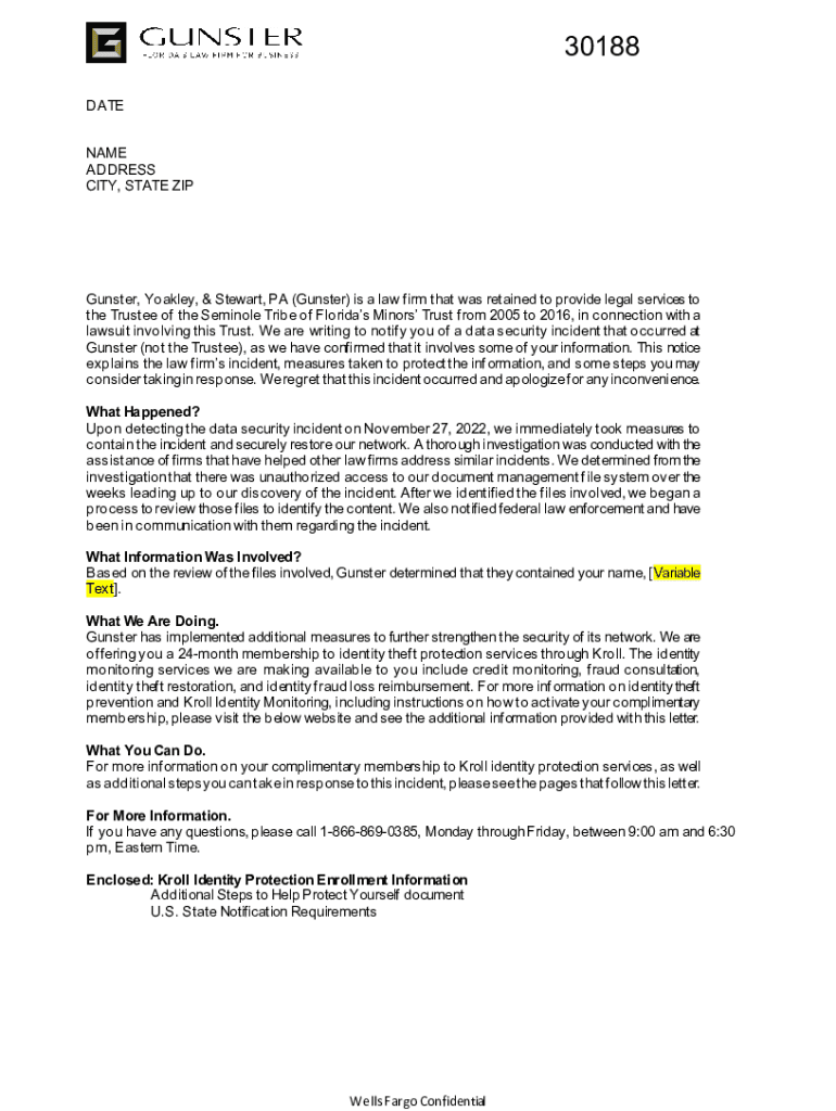 30188 DATE NAME ADDRESS CITY, STATE ZIPGunster, Yoakley, & Stewart, PA (Gunster) is a law f irm that was retained to provide legal services to the Trustee of the Seminole Tribe of Floridas Minors