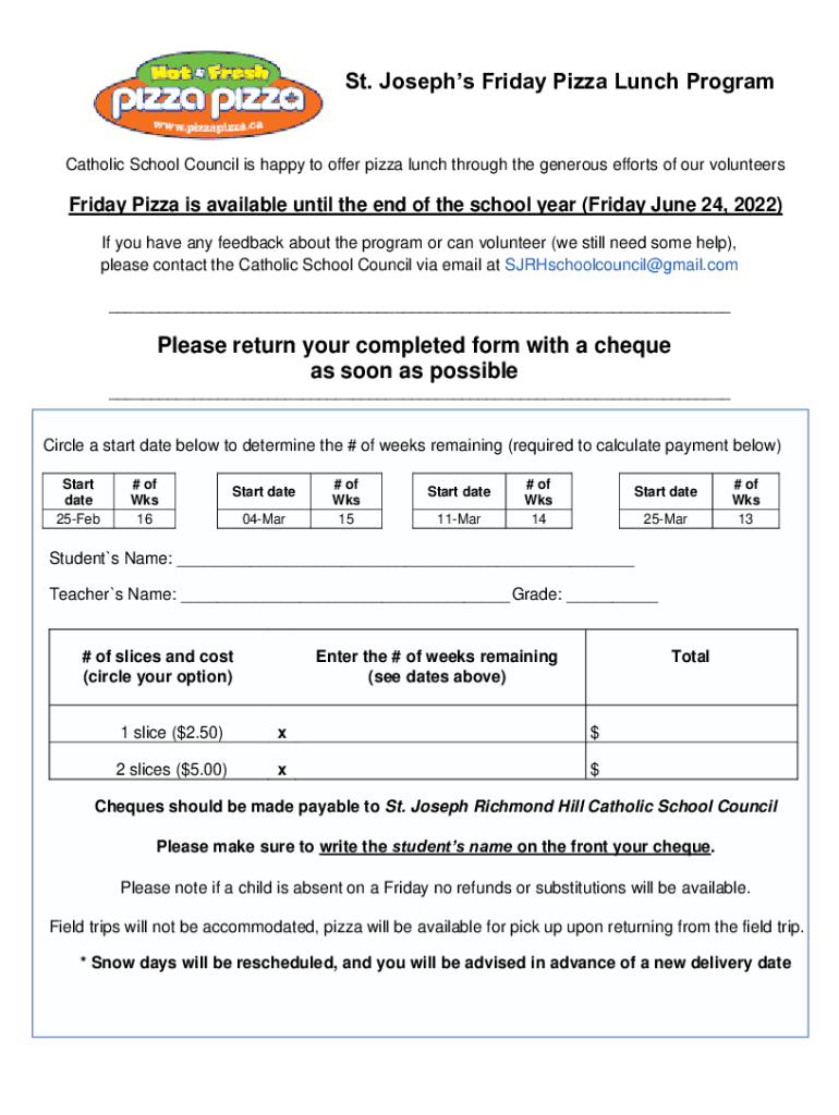 St. Josephs Friday Pizza Lunch ProgramCatholic School Council is happy to offer pizza lunch through the generous efforts of our volunteersFriday Pizza is available until the end of the school year