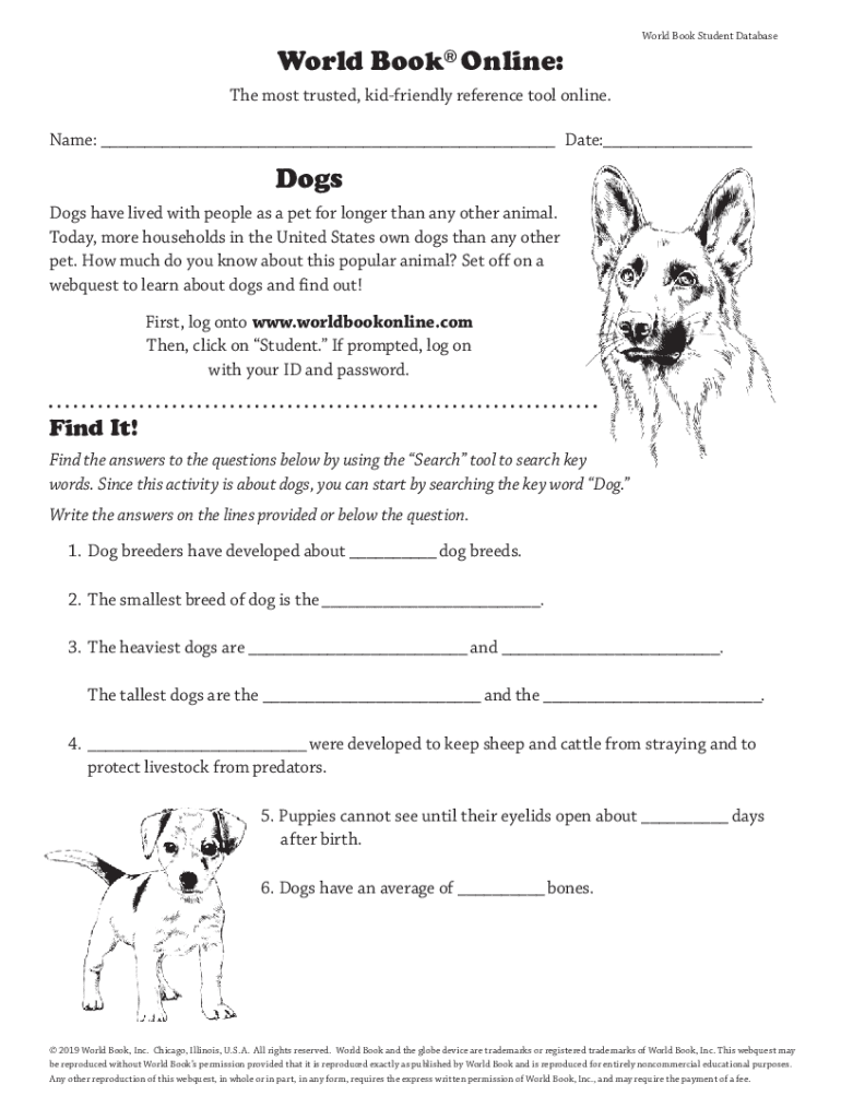 World Book Student DatabaseWorld Book Online: The most trusted, kidfriendly reference tool online. Name: ___ Date:___Dogs Dogs have lived with people as a pet for longer than any other animal. Today,