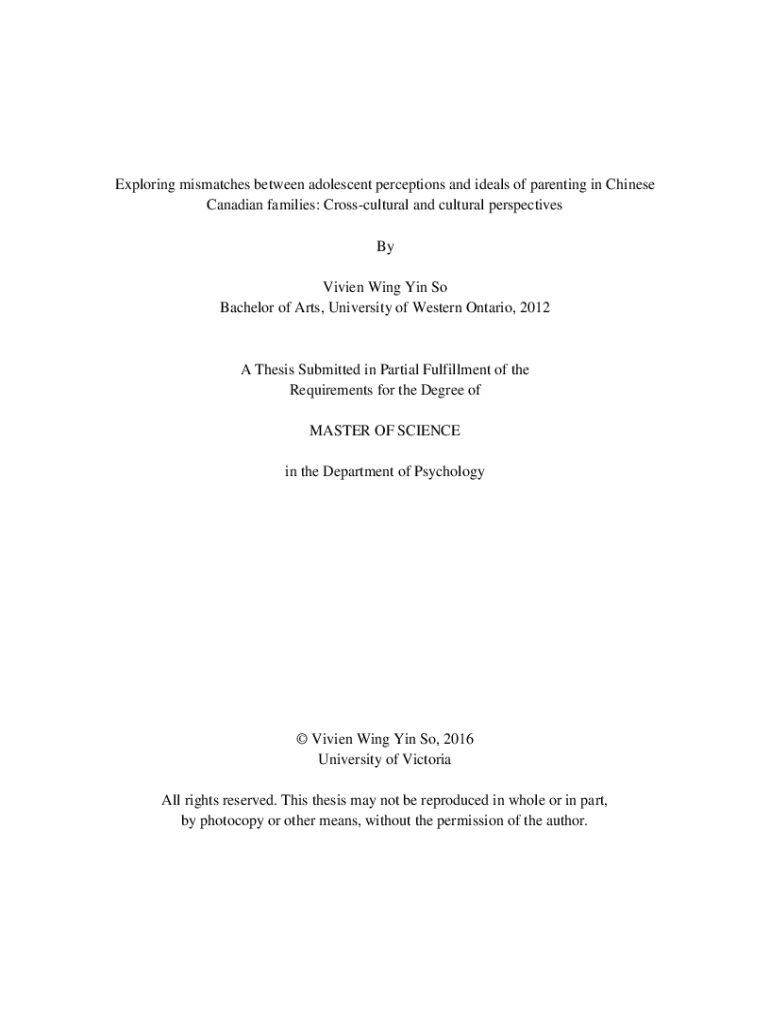Exploring mismatches between adolescent perceptions and ideals of parenting in Chinese Canadian families: Cross cultural and cultural perspectives By Vivien Wing Yin So Bachelor of Arts, University