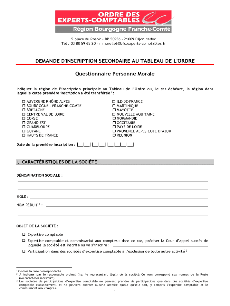 5 place du Rosoir BP 50956 21009 Dijon cedex Tl : 03 80 59 65 20 mmorellet@bfc.expertscomptables.frDEMANDE D\'INSCRIPTION SECONDAIRE AU TABLEAU DE L\'ORDRE Questionnaire Personne Morale Indiquer la