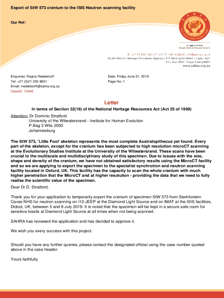 Export of STW 573 cranium to the ISIS Neutron scanning facility Ref:Inquiries: Reign RedelstorffDate: Friday, June 21, 2019Tel: +27 (0)21 202 8651Page No: 1Email: rredelstorff@sahra.org.za