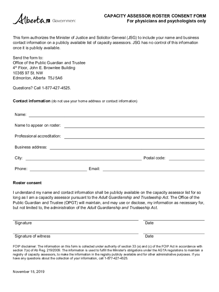 Get the free Capacity assessor roster consent form - physicians and psychologists