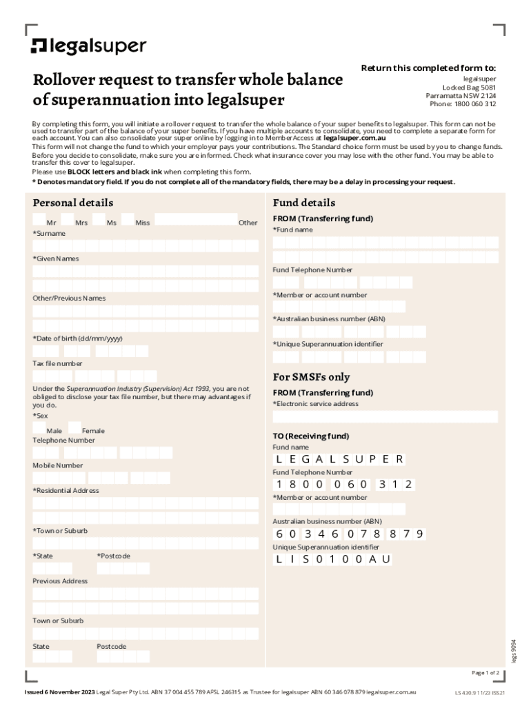 Rollover request to transfer whole balance of superannuation into legalsuperReturn this completed form to: legalsuper Locked Bag 5081 Parramatta NSW 2124 Phone: 1800 060 312By completing this form,