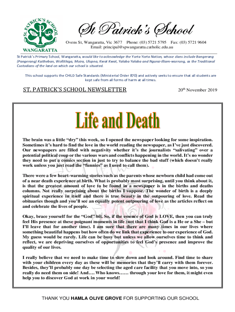 St Patricks Primary School, Wangaratta, would like to acknowledge