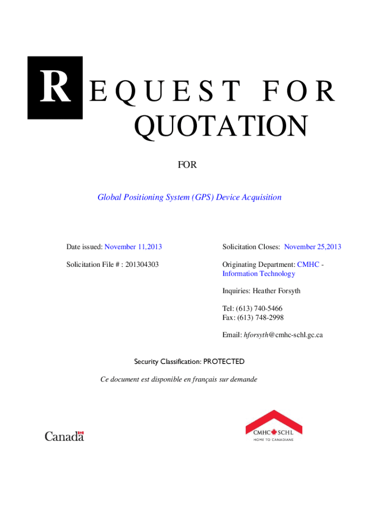 REQUEST FOR QUOTATION FOR Global Positioning System (GPS) Device AcquisitionDate issued: November 11,2013Solicitation Closes: November 25,2013Solicitation File # : 201304303Originating Department: