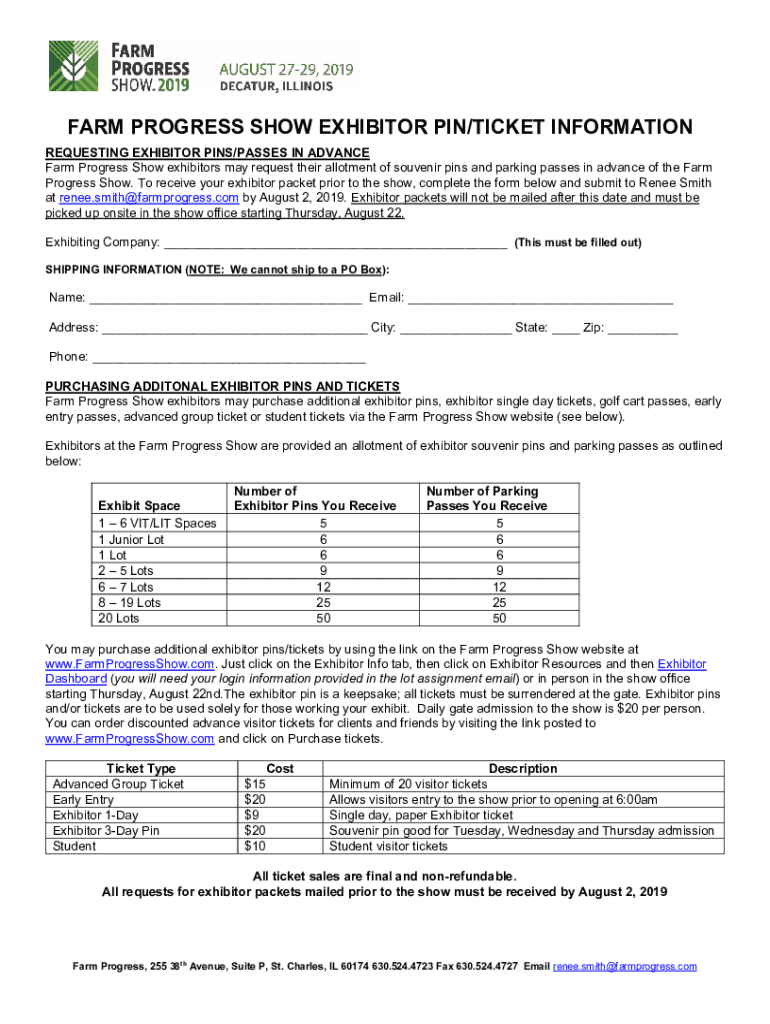 FARM PROGRESS SHOW EXHIBITOR PIN/TICKET INFORMATION REQUESTING EXHIBITOR PINS/PASSES IN ADVANCE Farm Progress Show exhibitors may request their allotment of souvenir pins and parking passes in advance