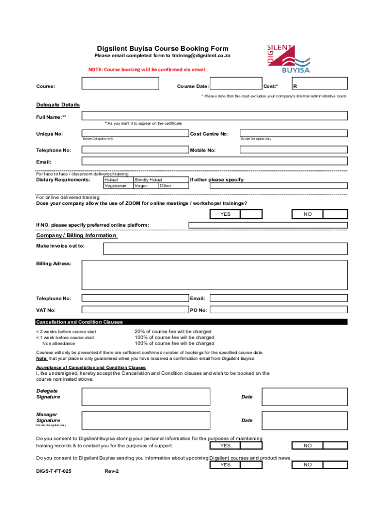 Digsilent Buyisa Course Booking Form Please email completed form to training@digsilent.co.zaNOTE: Course booking will be confirmed via email Course:Course Date:Cost:*R* Please note that the cost excludes