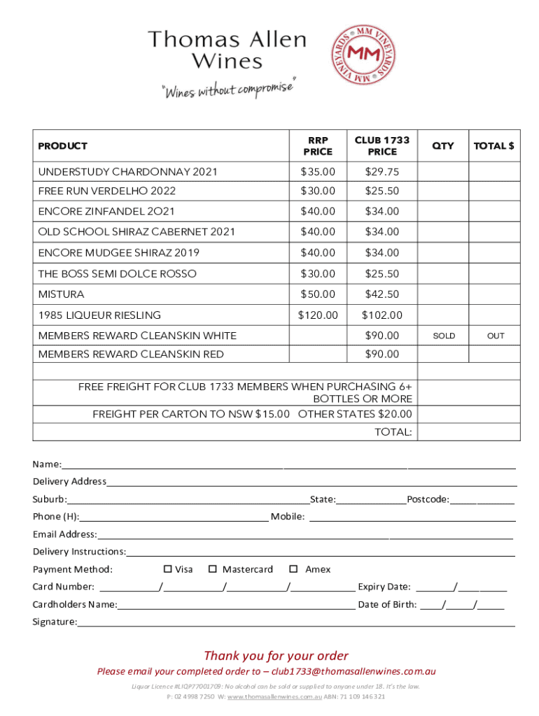 PRODUCTRRP PRICECLUB 1733 PRICEUNDERSTUDY CHARDONNAY 2021$35.00$29.75FREE RUN VERDELHO 2022$30.00$25.50ENCORE ZINFANDEL 2O21$40.00$34.00OLD SCHOOL SHIRAZ CABERNET 2021$40.00$34.00ENCORE MUDGEE SHIRAZ