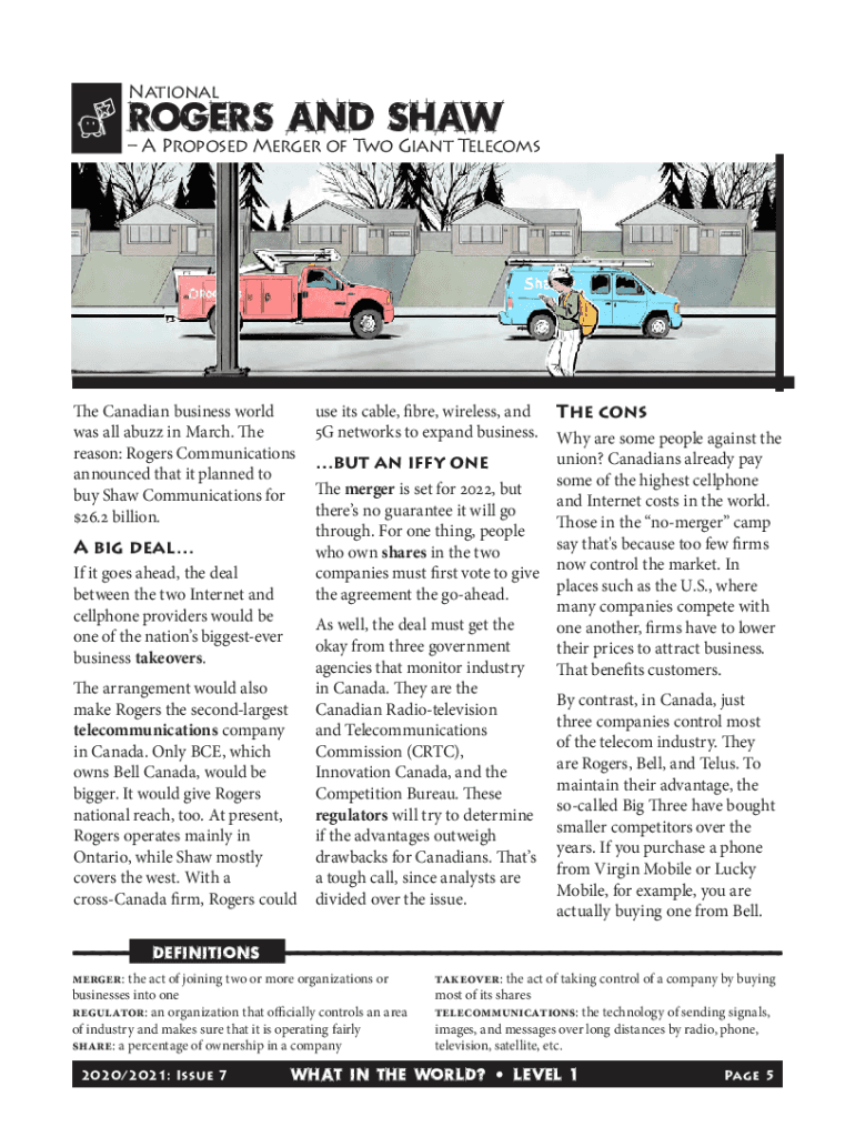 NationalRogers and Shaw A Proposed Merger of Two Giant TelecomsThe Canadian business world was all abuzz in March. The reason: Rogers Communications announced that it planned to buy Shaw Communications