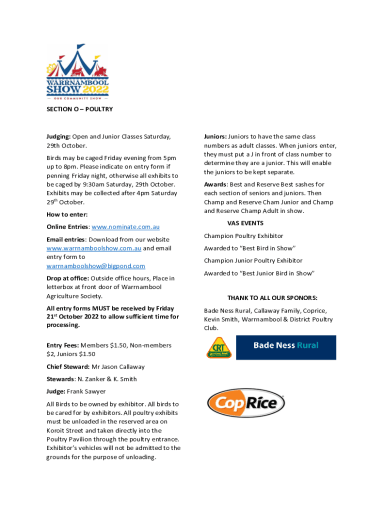 SECTION O POULTRYJudging: Open and Junior Classes Saturday, 29th October. Birds may be caged Friday evening from 5pm up to 8pm. Please indicate on entry form if penning Friday night, otherwise all