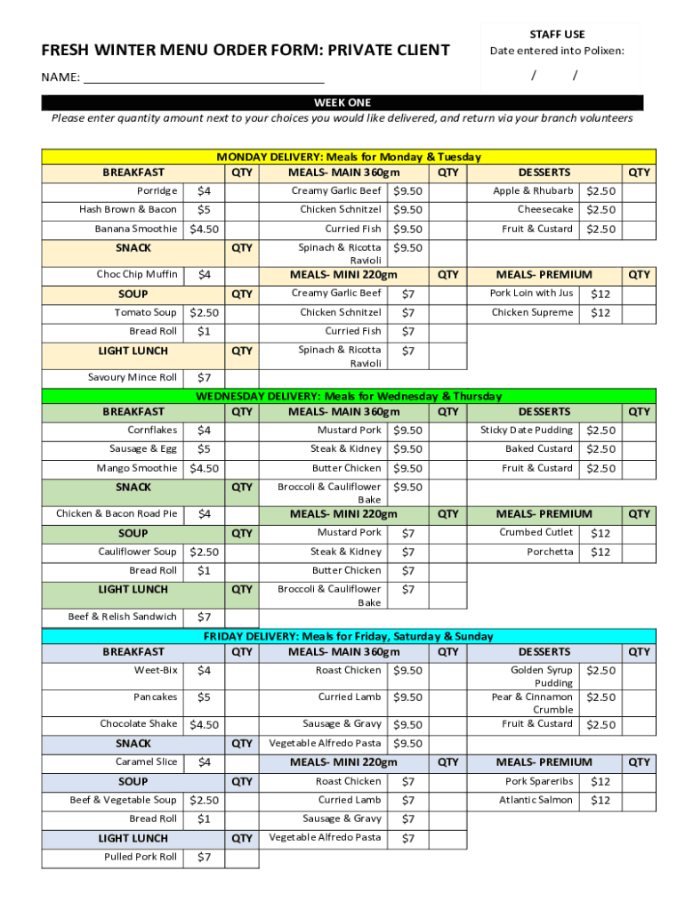 STAFF USE Date entered into Polixen:FRESH WINTER MENU ORDER FORM: PRIVATE CLIENT/NAME: ___/WEEK ONE Please enter quantity amount next to your choices you would like delivered, and return via your