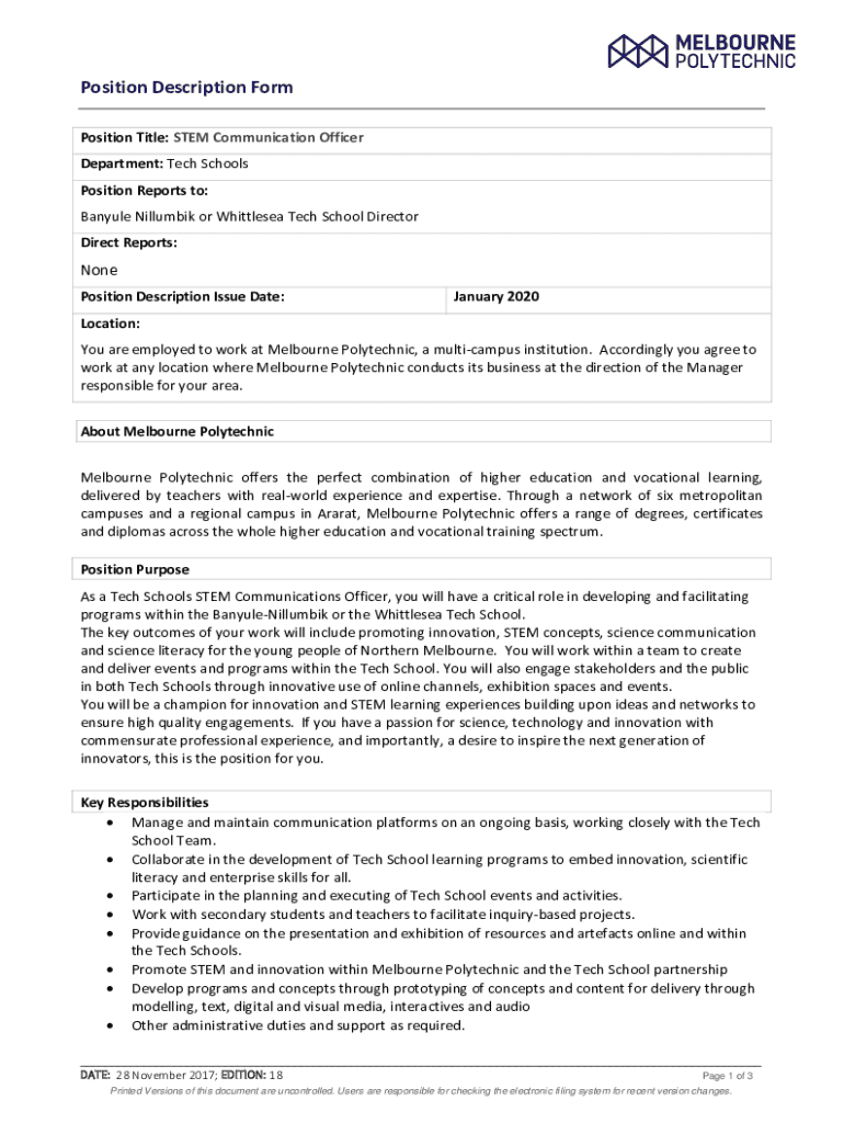 Position Description Form Position Title: STEM Communication Officer Department: Tech Schools Position Reports to: Banyule Nillumbik or Whittlesea Tech School Director Direct Reports:None Position