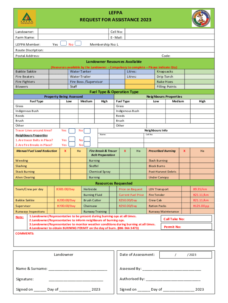 LEFPA REQUEST FOR ASSISTANCE 2023 Landowner:Cell No:Farm Name:E Mail:LEFPA Member:YesNoMembership No: LRoute Discription: Postal Address:Code:Landowner Resources Available (Resources available by