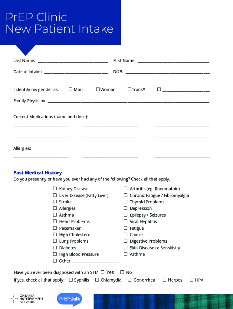 PrEP Clinic New Patient Intake Last Name: ___First Name: ___Date of Intake: ___DOB: ___I identify my gender as: ManWomanTrans* ___Family Physician: ___ Current Medications (name and dose):________________________Allergies:___Past