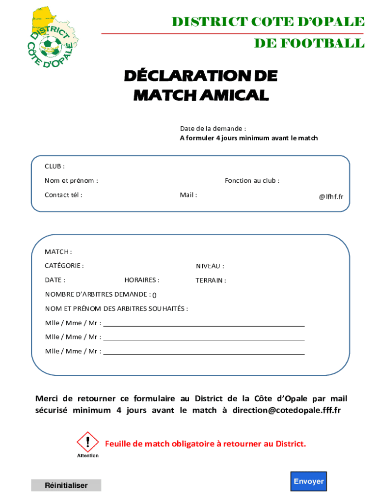 DISTRICT COTE DOPALE DE FOOTBALLDCLARATION DE MATCH AMICAL Date de la demande : A formuler 4 jours minimum avant le matchCLUB : Nom et prnom :Fonction au club :Contact tl :Mail :@lfhf.frMATCH : CATGORIE