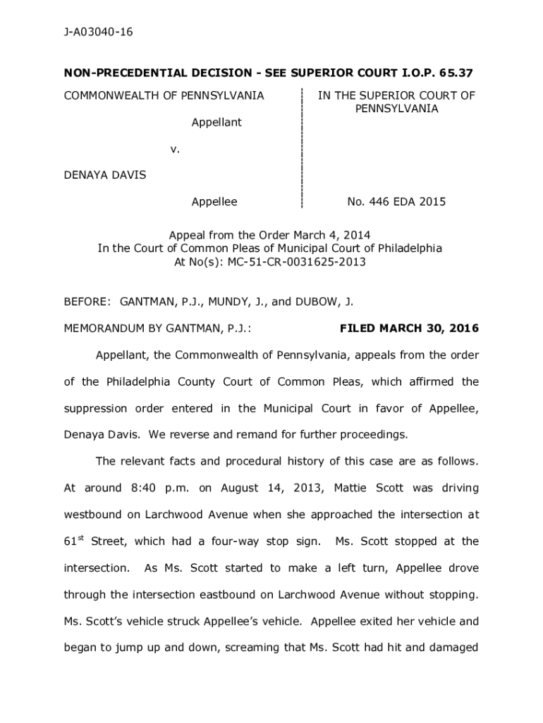 JA0304016NONPRECEDENTIAL DECISION SEE SUPERIOR COURT I.O.P. 65.37 COMMONWEALTH OF PENNSYLVANIAIN THE SUPERIOR COURT OF PENNSYLVANIAAppellant v. DENAYA DAVIS AppelleeNo. 446 EDA 2015Appeal from the