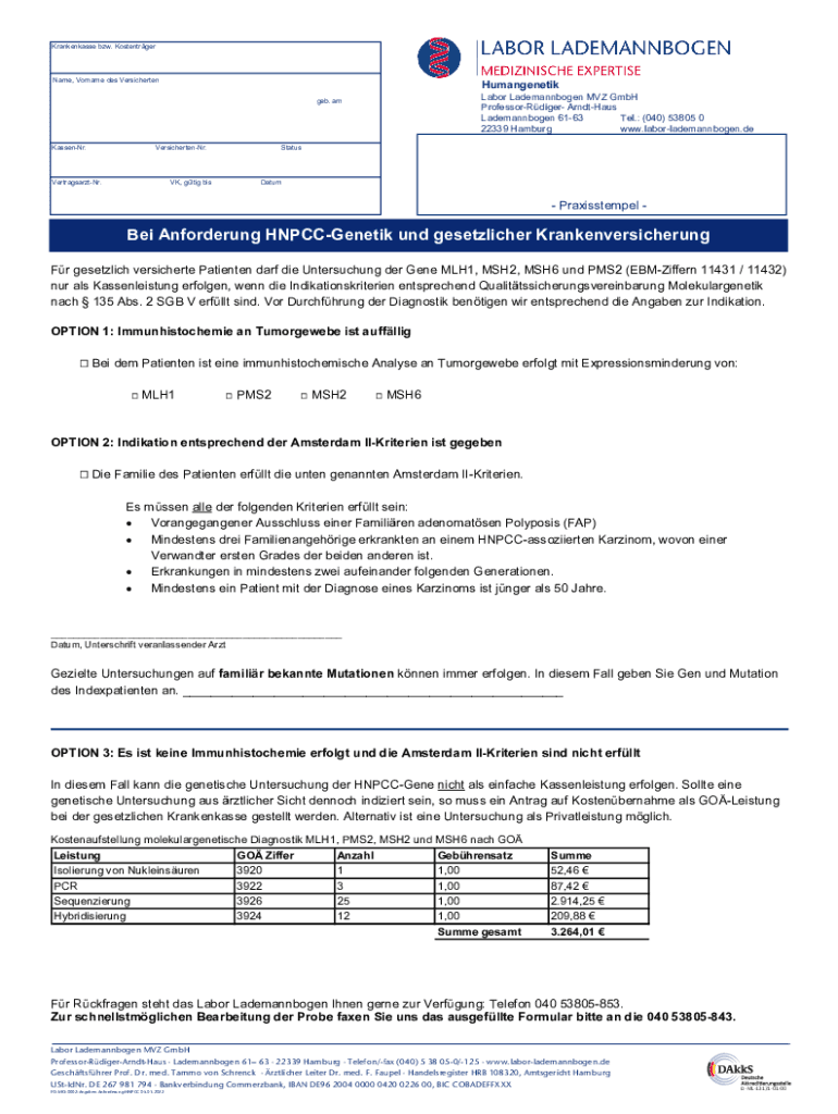 Krankenkasse bzw. KostentrgerName, Vorname des VersichertenHumangenetik Labor Lademannbogen MVZ GmbH ProfessorRdiger ArndtHaus Lademannbogen 6163 Tel.: (040) 53805 0 22339 Hamburg www.laborlademannbogen.degeb.