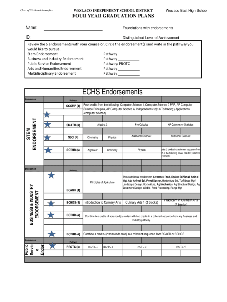 Class of 2018 and thereafterWESLACO INDEPENDENT SCHOOL DISTRICTWeslaco East High SchoolFOUR YEAR GRADUATION PLANS Name:Foundations with endorsementsID:Distinguished Level of AchievementReviewthe5endorsementswithyourcounselor.Circle