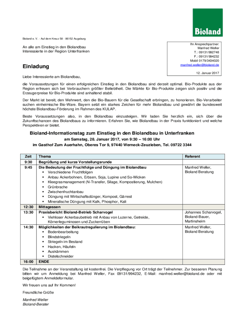Bioland e. V. Auf dem Kreuz 58 86152 AugsburgAn alle am Einstieg in den Biolandbau Interessierte in der Region UnterfrankenEinladungIhr Ansprechpartner: Manfred Weller T.: 09131/992748 F.: 09131/994232