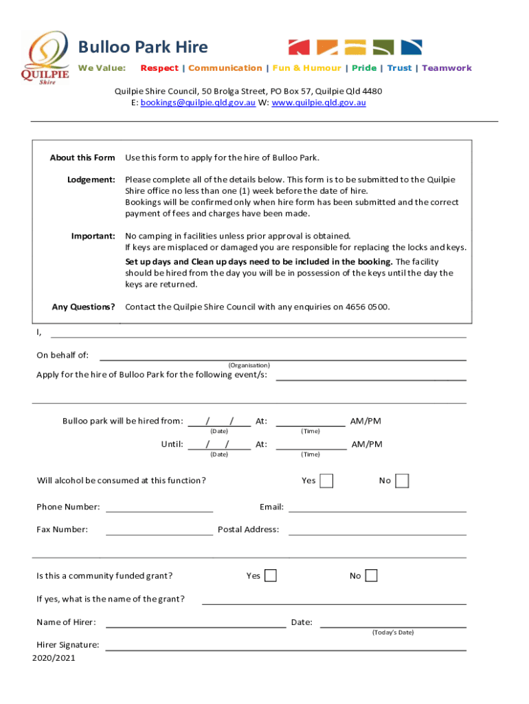 Bulloo Park Hire We Value:Respect | Communication | Fun & Humour | Pride | Trust | TeamworkQuilpie Shire Council, 50 Brolga Street, PO Box 57, Quilpie Qld 4480 E: bookings@quilpie.qld.gov.au W: www.quilpie.qld.gov.auAbout