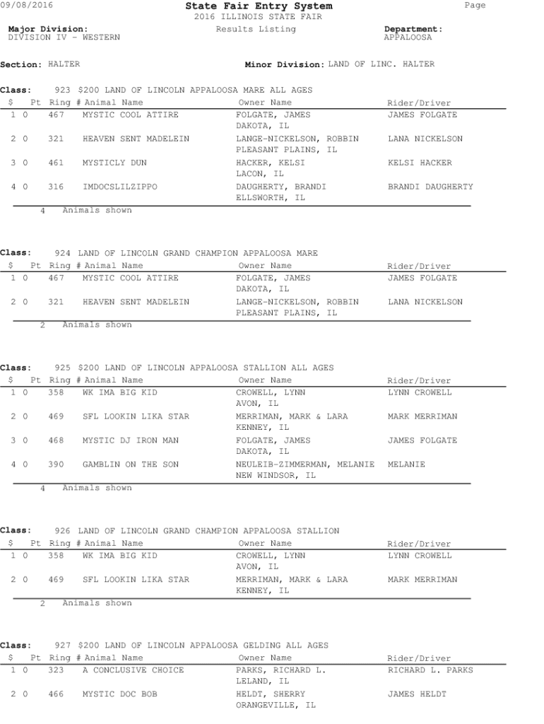 09/08/2016 Major Division: DIVISION IV WESTERNSection: HALTERPageState Fair Entry System 2016 ILLINOIS STATE FAIR Results ListingDepartment: APPALOOSAMinor Division: LAND OF LINC. HALTERClass: 923
