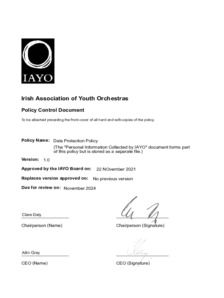 To be attached preceding the front cover of all hard and soft copies of the policy. Policy Name: Data Protection Policy