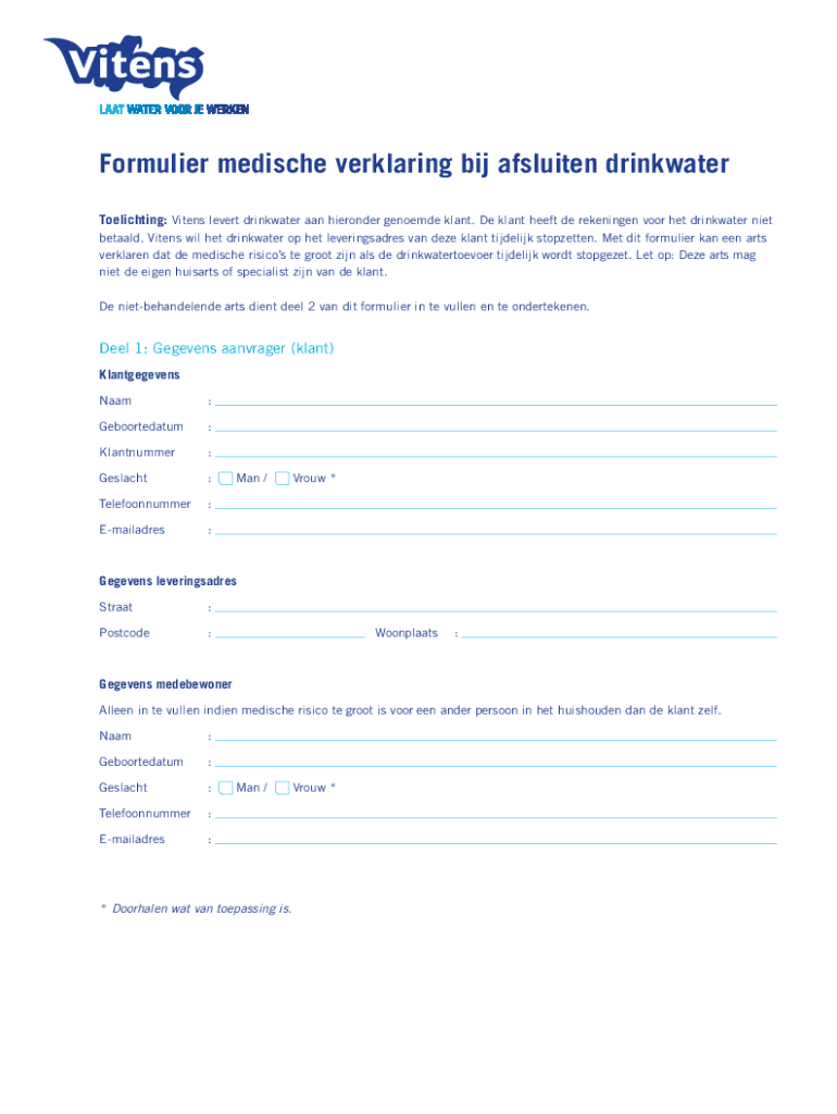 Formulier medische verklaring bij afsluiten drinkwater Toelichting: Vitens levert drinkwater aan hieronder genoemde klant. De klant heeft de rekeningen voor het drinkwater niet betaald. Vitens wil