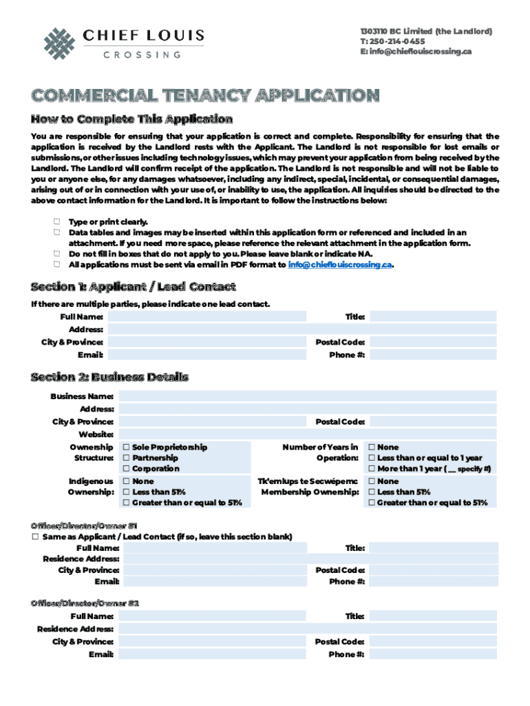1303110 BC Limited (the Landlord) T: 2502140455 E: info@chieflouiscrossing.caCOMMERCIAL TENANCY APPLICATION How to Complete This Application You are responsible for ensuring that your application