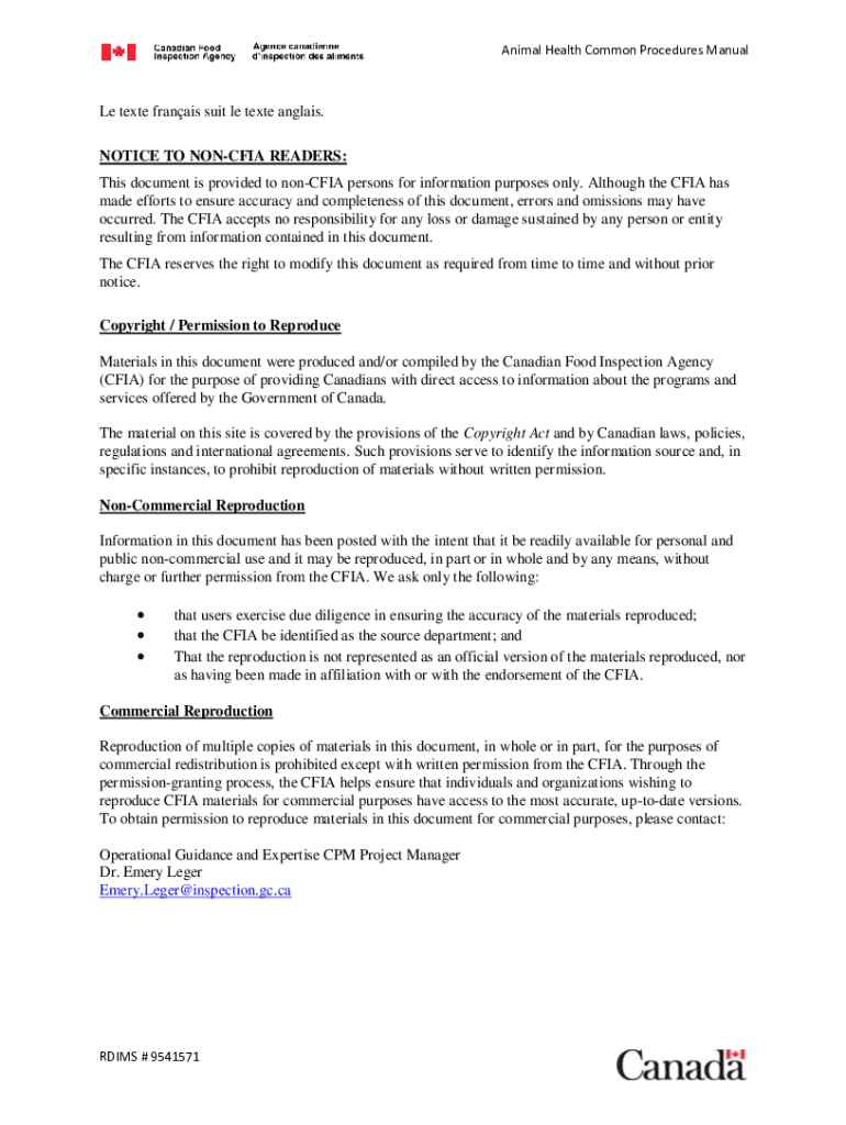 Animal Health Common Procedures ManualLe texte franais suit le texte anglais. NOTICE TO NONCFIA READERS: This document is provided to nonCFIA persons for information purposes only. Although the CFIA
