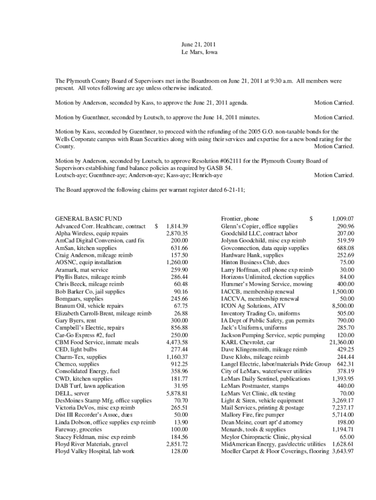 June 21, 2011 Le Mars, IowaThe Plymouth County Board of Supervisors met in the Boardroom on June 21, 2011 at 9:30 a.m. All members were present. All votes following are aye unless otherwise indicated.